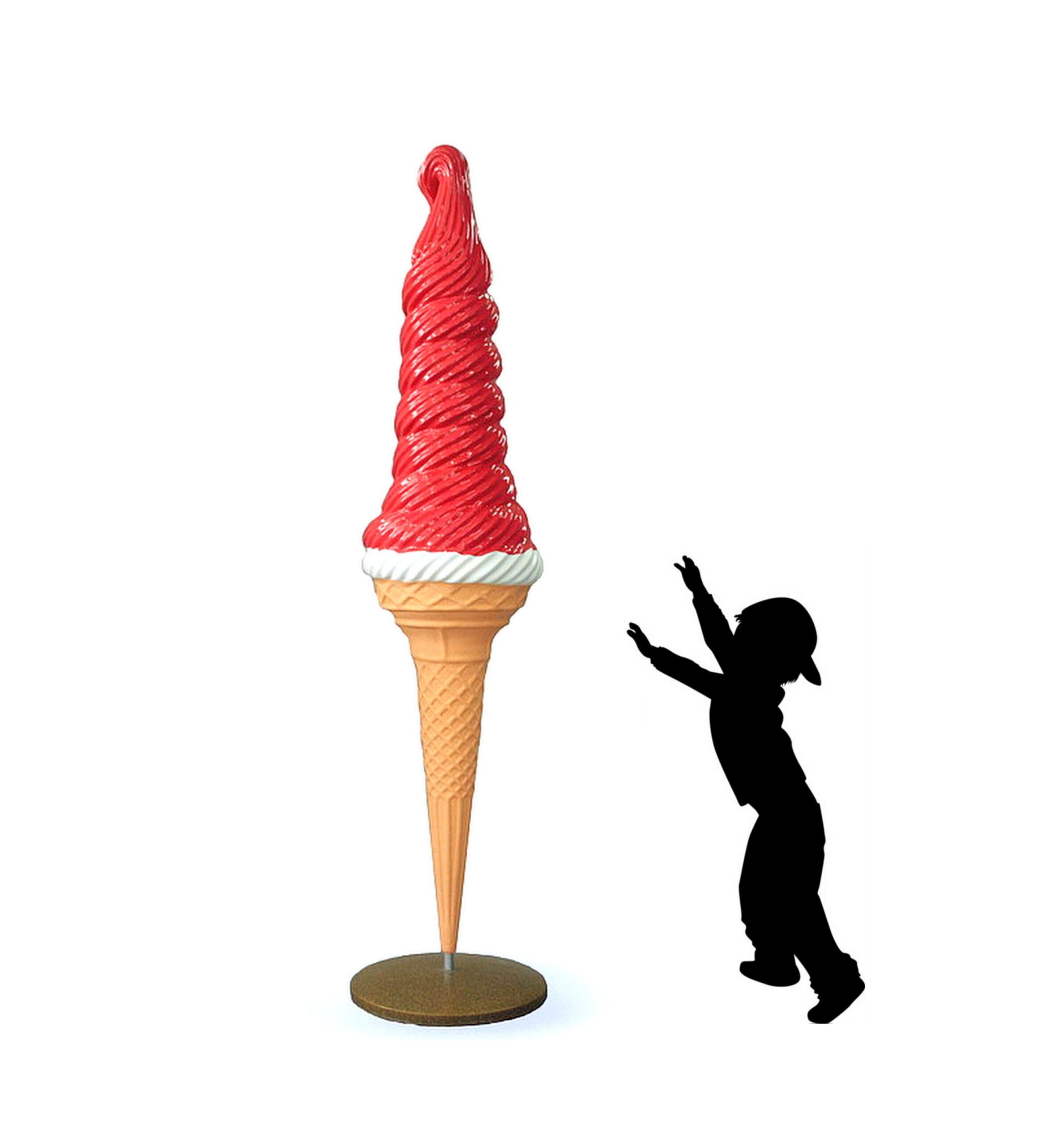 Mit imposanten Maßen von 230 cm Höhe und 46 cm Durchmesser zieht dieses Werbe-Eis mit seiner ungewöhnlichen Form und intensiv roter Farbe die Aufmerksamkeit auf sich. Realistische Details wie die Textur des Waffelkegels und das Aussehen der Sahnehaube machen es nicht nur zu einem Werbeobjekt, sondern zu einem echten Kunstwerk.