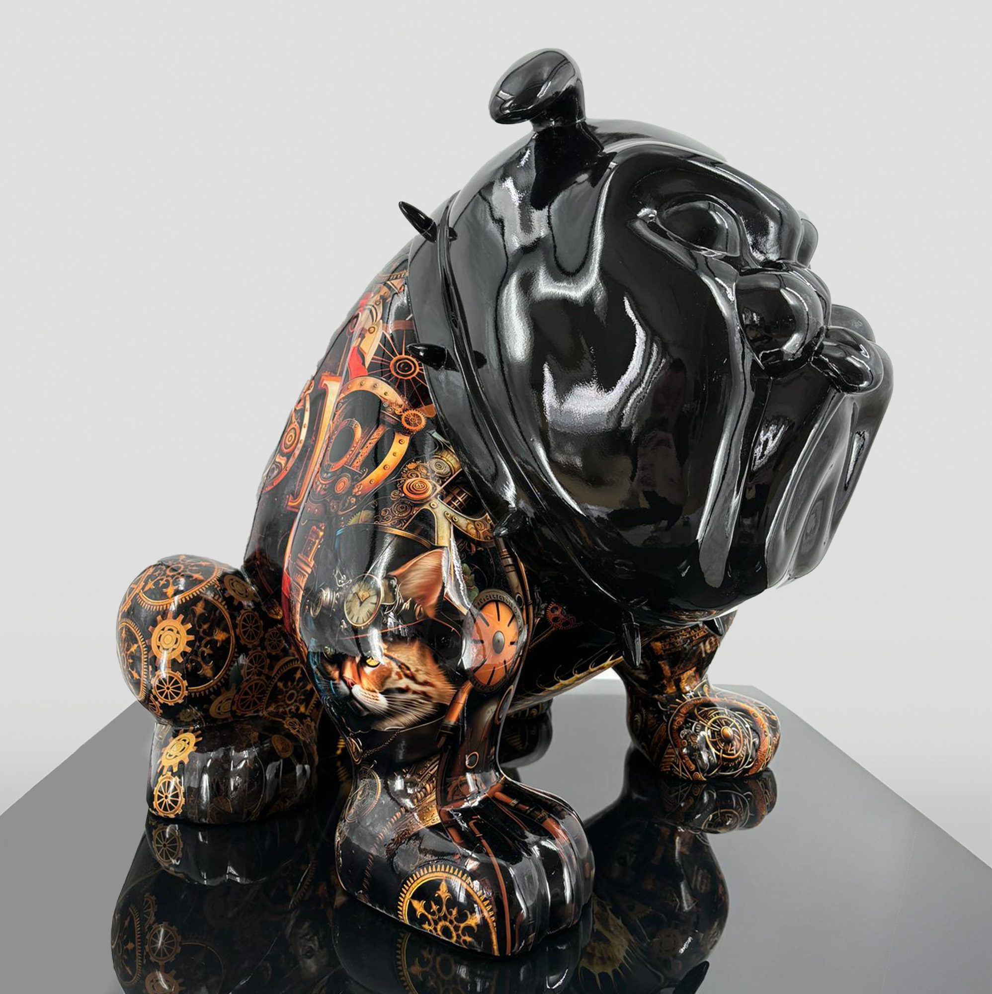 Bulldogge “Avella” in Folie mit industriellem Motiv eingewickelt.