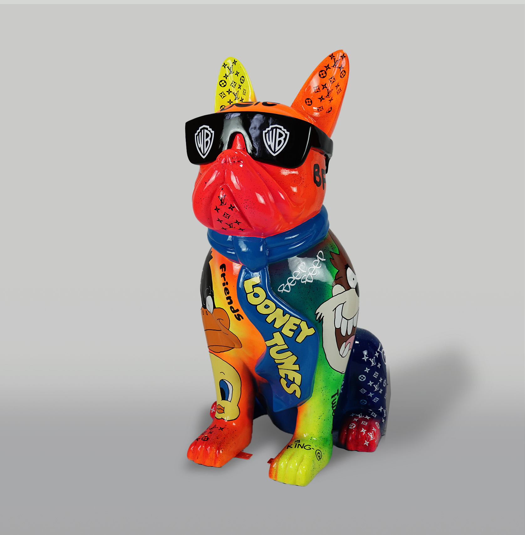 Mittlere Bulldoggenfigur mit Krawatte und Brille. Handbemalt mit der Spraytechnik und mit Aufklebern verziert.