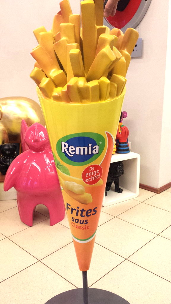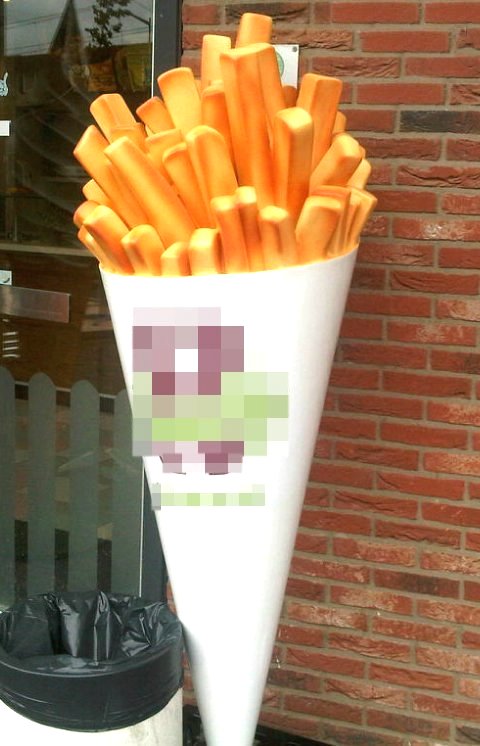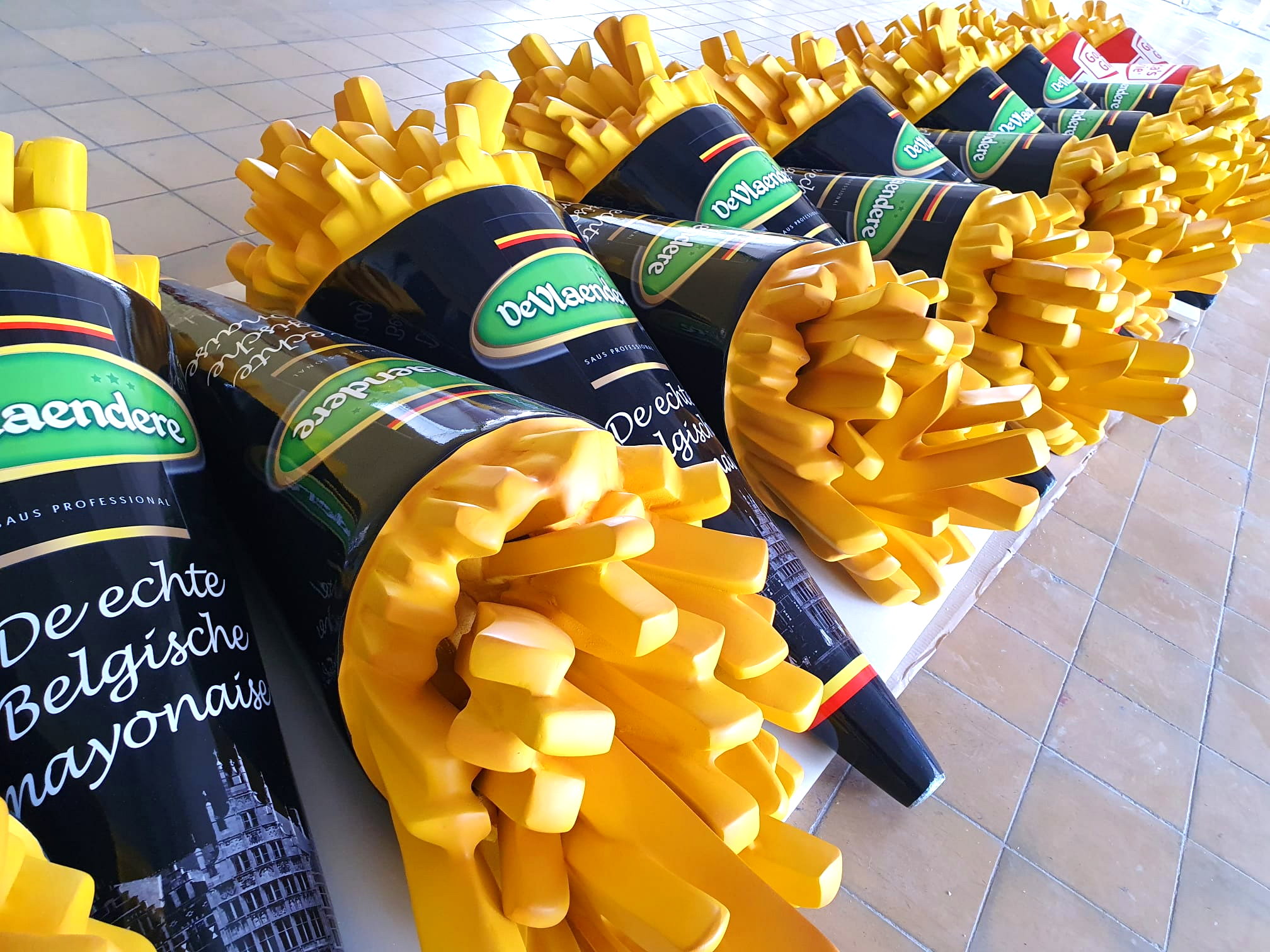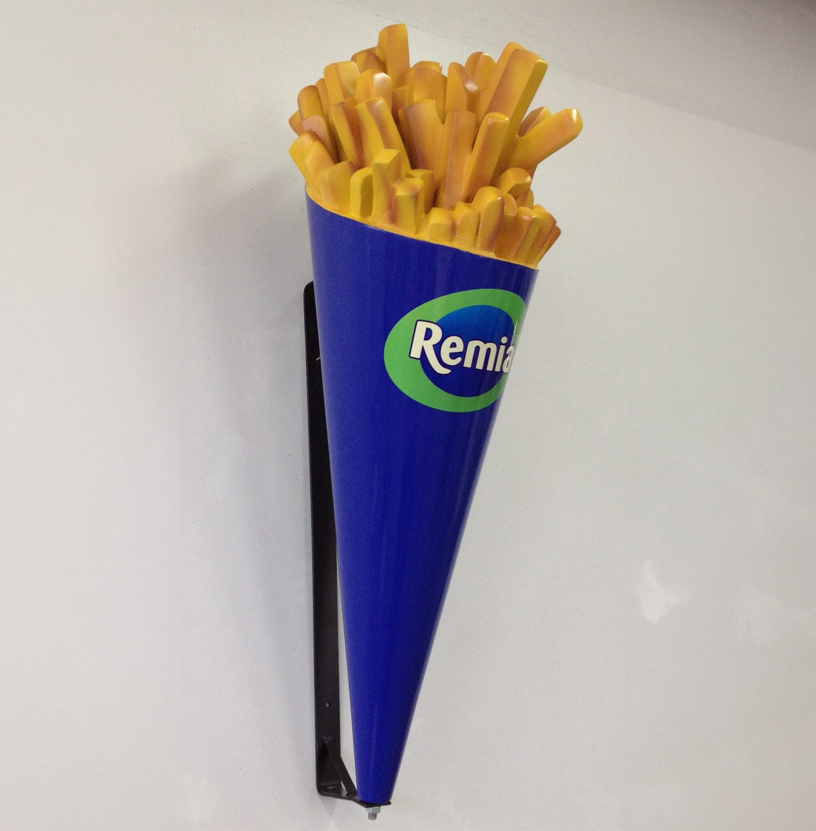 Erstaunliche 3D-Figur von hängenden Pommes – die ideale Werbung für Ihr Lokal!